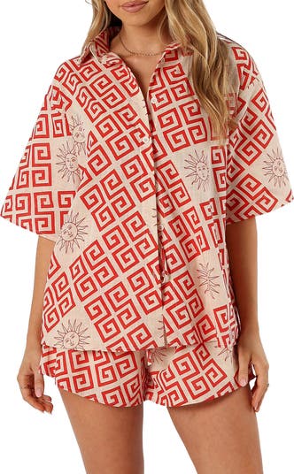 Laid-back days get even better in this matching shirt and shorts set made from airy cotton with a summery allover print.