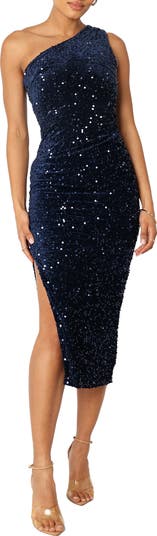 Illuminate the dance floor in this one-shoulder velvet midi dress covered in sparkling sequins and finished with sultry side slit.