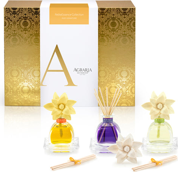 - Gold foil-lined gift box with: 3 PetiteEssence Diffusers: Each 1.7 oz/50 mL, 2” L x 2” W x 3.75” H