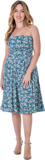 Freshen up your warm weather wardrobe with this petite strapless floral dress. Featuring a rouched bodice that provides a secure and flattering fit this style flows into a breezy knee length skirt for an easy carefree silhouette. The vibrant teal floral print adds a playful pop of color making it perfect for sunny days casual outings or beachside getaways. Comfortable lightweight and effortlessly stylish this dress is a go to favorite for summer.