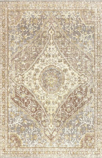 Ornate medallions in the center of this design recall vintage Turkish rugs, but the color palette is modern. Neutral gray-brown mingles with ivory for a distressed look. Use this stylish rug in a city apartment or coastal home, for a bedroom, living room, dining room or den.