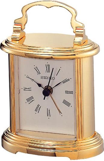 The Seiko Peyton clock simple and elegant. This smaller profile carriage-style clock with a pivoting handle is a find. Plus, it has a beep alarm clock. It is substantial piece as it is made of alloy metal and is golden in color. Traditionally styled analog clock with features a white face with black Roman numerals. Fitted with precise quartz movement. Perfect for any table, mantel or shelf. Powered by 1 AA battery (included). Overall dimensions: 4.25 X 3 X 2 inches.