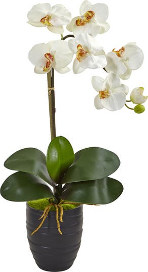 A single faux Phalaenopsis orchid rises from a simple black ceramic vase in this elegant arrangement. Reminiscent of Asian flower arrangements, this artificial Phalaenopsis orchid will bring a feeling of tranquility to any room in your home or office.
