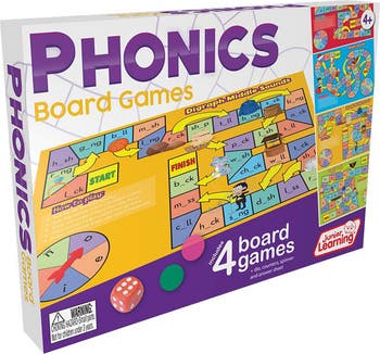 PHONICS BOARD GAMES - Make phonics learning fun and engaging with Junior Learning Phonics Board Games – a dynamic way for young learners to practice early literacy skills through interactive play! Designed for children aged 4–5 and perfect for Pre-K to Kindergarten, this set targets key phonics concepts including beginning sounds, middle sounds, digraphs, and final sounds. Each round transforms learning into a fun challenge that reinforces sound recognition and word-building. By connecting phonics with gameplay, children stay motivated and eager to practice. Each game board is double-sided with colorful illustrations that captivate young learners. Players spin the included spinner to move around the board and answer phonics-related challenges. The built-in spinner adds a dynamic, game-show-like element to every session, making phonics learning exciting and unpredictable. Players spin to move around the board, completing engaging word challenges that reinforce sound awareness and spelling patterns. With space for 2 to 6 players, it s ideal for small group instruction, literacy centers, or family game time at home. The set also includes an answer sheet to support self-checking, helping children gain confidence and learn independently. It promotes collaboration and communication while offering enough flexibility for solo play when needed. The cooperative yet competitive structure makes it perfect for literacy centers, after-school programs, or homeschool activities. Children practice key phonics concepts while having fun with friends, siblings, or classmates. Whether used in the classroom or at home, these board games turn phonics practice into an exciting educational experience.