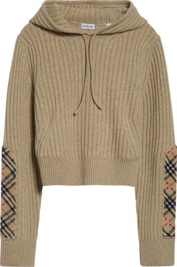 Nubby bouclé patches of instantly recognizable Burberry checks bring heritage character to this cropped wool-cashmere hoodie that combines the best of both casual sportswear and professional tailoring.