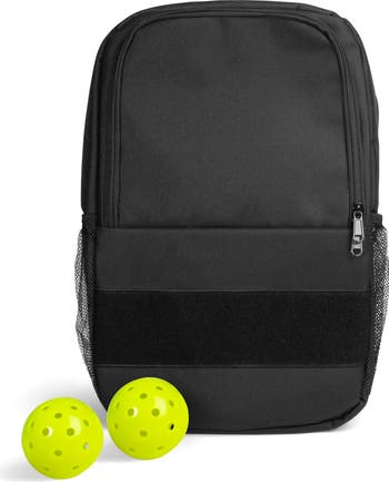 - *One (1) 11-in x 7.5-in x 17.5-in Backpack, two (2) 3-in dia. Pickleballs *Backpack includes reinforced stitching and padded shoulder straps for extra durability *Water-repellent construction to keep bags and personal items dry *Small zipper compartment perfect for organizing keys, wallets, phones, and more *Large zipper compartment includes soft dividers to protect paddles *Front hook and loop for all your favorite patches *Convenient netted side compartments for extra storage *Pickleballs can be used for indoor and outdoor use ** Pickleball paddles and patches sold separately