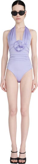 Deep halter neckline one-piece with an open back, ruched bodice that flatters and hugs the curves of every woman s body and a 3D handmade flower detail that represents the ever-blooming and changing Latin woman.