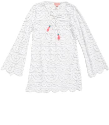 A delicate crochet pattern distinguishes a long-sleeve cover-up perfect for strolling along the beach.