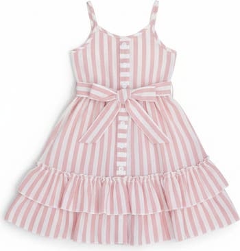 Let her style shine in the Pink Candy Stripe Button Up Ruffle Dress! Featuring vibrant pink stripe, this dress is designed to turn heads.