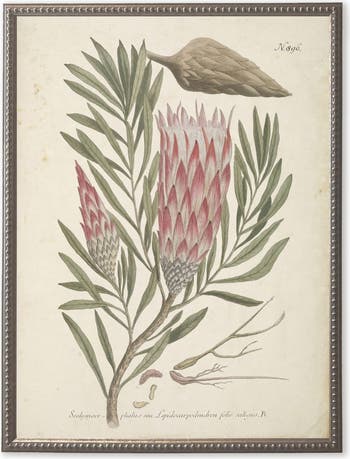 This vintage-inspired print, framed in a silver-beaded wooden frame, features a pink, coned flower. Sized at 18 inches by 24 inches, this made in the USA frame makes for a beautiful addition to any wall.