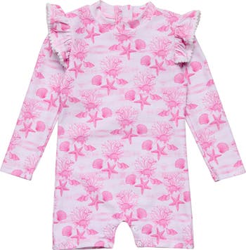 They ll be serving coastal flair as they splash and play in this one-piece swimsuit made with pom-trimmed ruffles and long sleeves that block out the sun, sand and surf.
