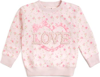 This adorable pink floral sweatshirt features a sparkling “LOVE” patch framed by a satin heart and bow, adding the perfect touch of sweetness to any cozy outfit.