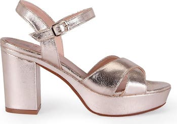 A modern platform sandal crafted from metallic leather with a rounded toe and adjustable ankle strap. A block heel and cushioned footbed offer comfort and elegance for any occasion.