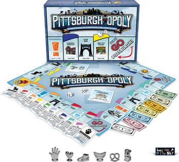 Pittsburgh-opoly takes a fun twist on the ever popular classic monopoly game. The city of Pittsburgh Pennsylvania related games are fun toys and game collectibles. Game spaces include Kennywood, Primanti Brothers, Heinz USA, Three Rivers Stadium, Andy Warhol Museum, and The Point. Late for the Sky Pittsburg-Opoly Board Game is designed for all ages, Adults and Children.