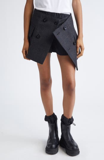 A double-breasted closure refreshes this pleated, plaid miniskirt made of dense wool melton and popped with flap pockets for an aesthetic that looks like you repurposed and got creative with an old blazer.
