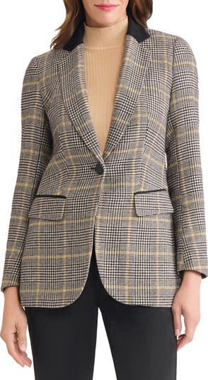 Contrast elbow patches and collar elevate a handsome blazer covered in smart plaid and featuring a back vent for easeful movement.