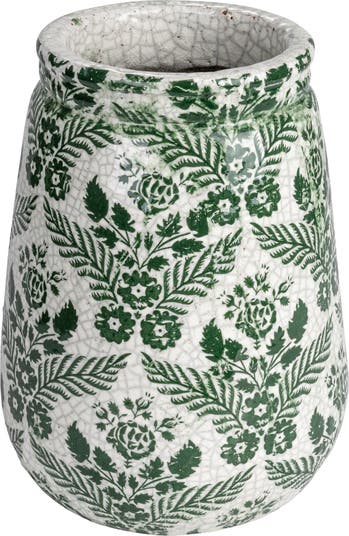 - A lovely and unique terra-cotta planter/vase that has a flower pattern and a crackle glaze in green and white colors