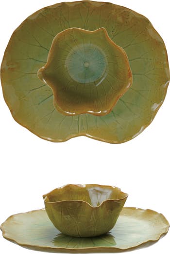 This Stoneware Water Lily Plate with Bowl, featuring a reactive crackle glaze in green, is a stunning addition to any home. Crafted from durable stoneware, this set showcases a beautiful water lily design, making each piece unique due to the reactive crackle glaze finish. Perfect for garden, forest, botanical, or farmhouse interiors, this set is ideal for serving meals or as a decorative piece. The plate measures 11.25 inches in length and 9.25 inches in width, while the bowl measures 5.75 inches in diameter and 2.75 inches in height, combining aesthetics and functionality. This set s earthy tones and intricate details will add a touch of nature-inspired elegance to any dining table or display shelf. Whether used for everyday meals or special occasions, this set will impress guests and elevate the ambiance of any space.