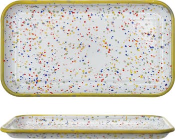 This lively Enameled marbleware Plate, adorned with a cheerful yellow rim and a multicolor design, brings a touch of whimsy and charm to the dining experience. Crafted from durable metal with a glazed finish, it is perfect for serving appetizers or desserts, making it a delightful addition to any meal. Ideal for farmhouse, cabin, cottagecore, or lodge interiors, this plate adds a playful yet practical element to the table setting. Measuring 8.5 inches in length and 4.75 inches in width, it combines durability with a vibrant aesthetic, enhancing the joy of dining. Its vibrant colors and whimsical pattern will brighten up any table setting, making it a fun and functional addition to the kitchenware collection.