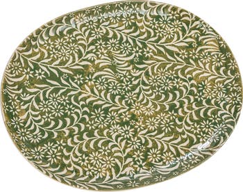 This stoneware platter with wax relief botanicals in green is a beautiful and functional addition to any home. It is made of stoneware, which is a premium and sturdy material that can withstand high temperatures and frequent use. It is microwave, oven, and dishwasher safe, making it easy and convenient to use and clean. It is adorned with wax relief botanicals in green, which are hand-applied and create a textured and glossy effect on the surface. The botanicals add some color and charm to the platter, and showcase the beauty and variety of nature. The platter has an oval shape that is perfect for serving main dishes, salads, cheese, or desserts, or for displaying candles, flowers, or ornaments on a table or countertop. It can match any farmhouse, French country, botanical, lodge, or cabin style kitchen or dining room. It measures 16.25 inches in length and 12.75 inches in width, making it a generous and spacious platter. This will impress the guests and enhance the food presentation.