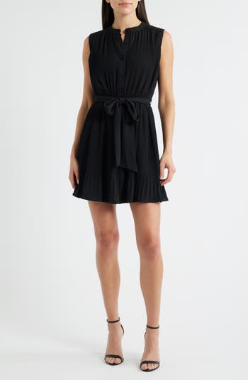 Crisp pleats add subtle dimension to a sleeveless minidress cinched with a matching tie belt.