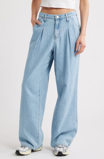 Well-placed pleats amplify the retro attitude of light-wash jeans made from a lightweight nonstretch denim in a wide-leg silhouette.