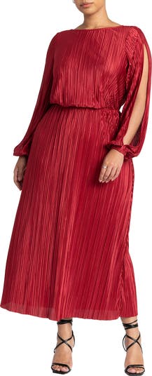 An easy satin-plissé midi with a boat neck, elastic waist, long sleeves, and a fluid side slit.