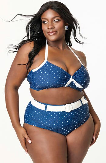 This sultry swim top from Unique Vintage features self tie halter neckline, molded padding, and a self tie back for perfect customizable fit!