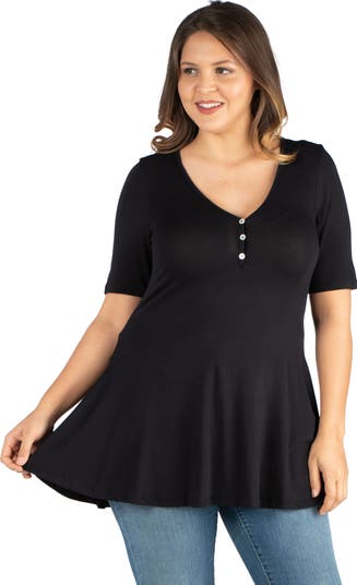 This versatile henley style plus size top is perfect for dressing up or down for any occasion. A delicate v neck, button detailing, slim fit waist and flared hemline makes this top a mix of fashion and practicality. Perfect to wear by itself during the warmer months or to layer with in the colder months. Pair this top with slacks and a blazer for a stylish professional look or dress it down with shorts and slides. Made from a comfortable stretch material. Rayon Spandex Knit.