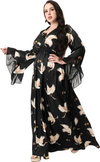 A charming 1960s style maxi silhouette crafted in a luxurious woven. Outfitted with three-quarter length sleeves that dance with ruffled chiffon-style cuffs while a back zipper nips in the empire waist.