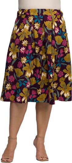 Plus Size Purple Floral Elastic Waist Pocket Midi Skirt