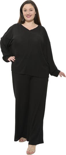 Effortless versatility meets comfort in this chic plus size two piece pant set from 24seven Comfort Apparel. The relaxed fit V neck top with long sleeves features small side slits at the hem for added movement and pairs perfectly with wide leg palazzo pants with a comfortable elastic waistband. Made from soft waffle knit fabric with cozy stretch, it is machine washable for easy care.