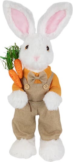 This delightful rabbit boy is dressed to impress, donning adorable burlap overalls that add a touch of rustic charm. With a stylish burlap bowtie and an orange long sleeve shirt, this cuddly friend is ready for the Spring festivities. Whether it s Easter festivities or springtime decorating, this lovable rabbit adds joy and a dash of whimsy to your decor. Made from soft, huggable materials, this p figure is perfect for both seasonal decorators and collectors alike. Product Features: Standing boy rabbit with carrots Easter figure Rabbit has soft white faux fur and holds 2 carrots Dressed in tan burlap overalls, an orange long sleeve shirt and bowtie The overalls are accented with 2 wooden buttons Bendable wire ears for easy positioning For indoor decorative use only Dimensions: 15“H X 5"W X 4.5"D Materials: polyester/burlap/faux fur/foam/plastic