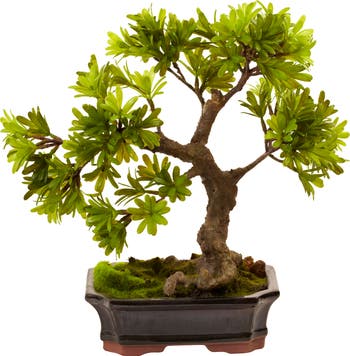 Elegant and ornately detailed, this is truly an exotic piece to add to your plant collection. The Podocarpus Bonsai stands at a delightful 14” inches, and features a single, delicate tree surrounded by moss that looks perfect in any kind of setting. Complementing the piece is this lovely glazed ceramic bonsai pot that frames the tree perfectly. Needing no water or care, this Pine Bonsai is truly a welcome addition to your home or desk.