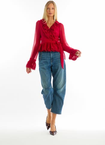 Secret Mission’s romantic Poet Blouse is crafted from 100% organic silk crinkle chiffon, offering a lightweight and fluid drape. The design features a ruffled neckline, flared cuffs, and an adjustable wrap top evoking a soft vintage-inspired silhouette. This top embodies elegance with subtle movement and charm.