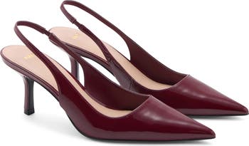 Sharpen your ensemble with this extraglossy slingback pump fronted with a pointy toe and balanced on a walkable kitten heel.