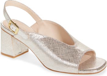 A square toe and wrapped block heel balance a creamy suede pump fashioned with an adjustable slingback strap for a secure fit.