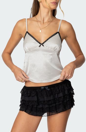 Touches of delicate lace trace the edges of a feather-light satin cami covered in cute polka dots and perfect for wearing solo or layering up.