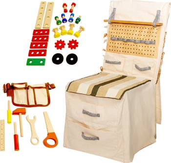 Encourage the aspiring builder in your family with our PopOhVer Builder Set! The creatively designed canvas cover quickly transforms a standard chair into your child s very own toolbench. Simply unfold the PopOhVer Ice Cream Shop Set over a household chair, place the inserts for stabilization, fasten the ties, and you are done! Complete with real wooden tools, your child can hammer, use a ruler to measure, and so much more. PopOhVer is perfect for teaching children valuable skills like counting, measuring, sharing, communication, and teamwork. Lightweight and portable, PopOhVer Ice Cream Shop is perfect for roleplay at sleepovers, play dates, birthday parties, and at grandma and grandpa s. Ideal for ages 3 years and up. WARNING: CHOKING HAZARD -- Small parts. Not for children under 3 yrs.