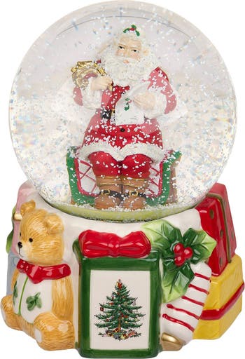 The Big Guy double checks his naughty/nice list as this snow globe plays Up On The House Top and a blizzard of flakes swirl with a good shaken.