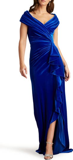 They ve already written a song about how enchanting you ll look in a beautiful blue velvet gown cut with a graceful drape and a face-framing portrait collar.