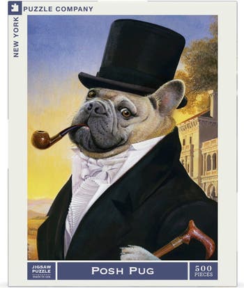 Step into the whimsical world of canine sophistication with Posh Pug, showcasing the playful artistry of Bill Mayer. This humorous and refined scene features a dapper pug dressed to the nines in a top hat, tails, and carrying a stately cane, striking a pose on the rich lawn of his grand seaside mansion. The idyllic setting and the pug s aristocratic demeanor make this puzzle an absolute delight to assemble.\r\n\r\nDesigned with 500 random die-cut pieces—ensuring no two are alike—this puzzle offers a fun and engaging challenge for puzzlers of all ages. Proudly made in the USA, Posh Pug combines high-quality craftsmanship with a touch of humor, making it a perfect gift for dog lovers, puzzle enthusiasts, or anyone who appreciates a bit of lighthearted fun.\r\n\r\nBring this charming and amusing scene to life, one piece at a time, and add a dash of elegance and humor to your puzzle collection!