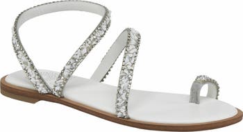 The POSITANO sandal features a leather upper with acrylic stone details and asymmetrical straps. A stylish and bold choice for adding flair to your wardrobe.