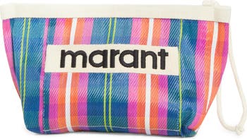 Colorful stripes pattern the jacquard nylon of this zip pouch saturated in a refreshingly purple palette.