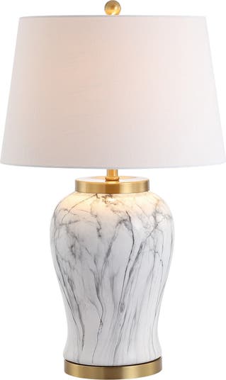 With its sturdy base and 28" height, this ceramic table lamp is built to have presence. In a faux-marble effect created by a hand-painted glaze, its neoclassical inspiration is made modern by the gold fittings and linen drum shade. Style extends all the way to the plug, with a 60" silk-wrapped cord.