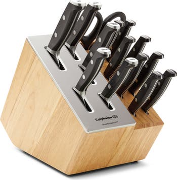 Marked by superior construction with full-tang design, this set of knives, plus a pair of kitchen shears and eight steak knives, forms the core of your food-prep and -service toolkit, while the accompanying knife block keeps each of the utility knives sharp and ready to use thanks to its spring-loaded sharpening slots.