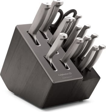 Marked by superior construction with full-tang design, this set of knives, plus a pair of kitchen shears and eight steak knives, forms the core of your food-prep and -service toolkit, while the accompanying knife block keeps each of the utility knives sharp and ready to use thanks to its spring-loaded sharpening slots.