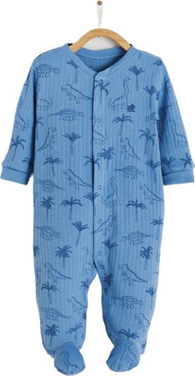This adorable footie features a beautiful design, with snap buttons at the front, it s easy to dress and undress your baby. Made from soft 100% cotton ribb, this footie ensures comfort and softness against your baby s skin. The print boasts a charming tropical design, complete with cute dinosaurs and palm trees, all set against a soothing blue background