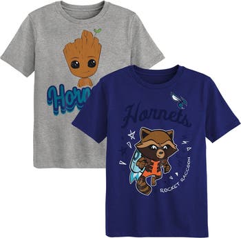Bring the excitement of the Charlotte Hornets and the Guardians of the Galaxy together with this fun two-piece T-Shirt set. One shirt features Groot and the team wordmark, while the other stars Rocket Raccoon alongside bold team graphics. This set is perfect for your little one to rep their favorite team and Marvel characters at the same time.