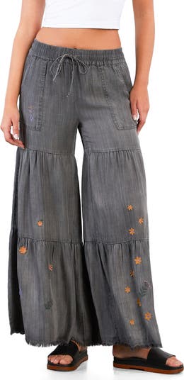 A tiered silhouette adds charming volume and movement to these flowy wide-leg pants sweetened by floral stitching.